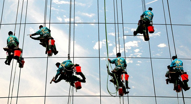 2、煙臺德力保潔公司的工作人員之間要有良好的協(xié)調(diào)合作精神:確認(rèn)應(yīng)清理部分已清理干凈,滑動吊籃或吊板,繼續(xù)向下清理。清理墻面時(shí),不允許嬉笑吵鬧及攜帶與工作無關(guān)的物品,工作人員之間要相互幫助。清理完成后,在地面工作人員的指揮下,小心的從吊籃上下來。收拾好清理工具后方可離去。